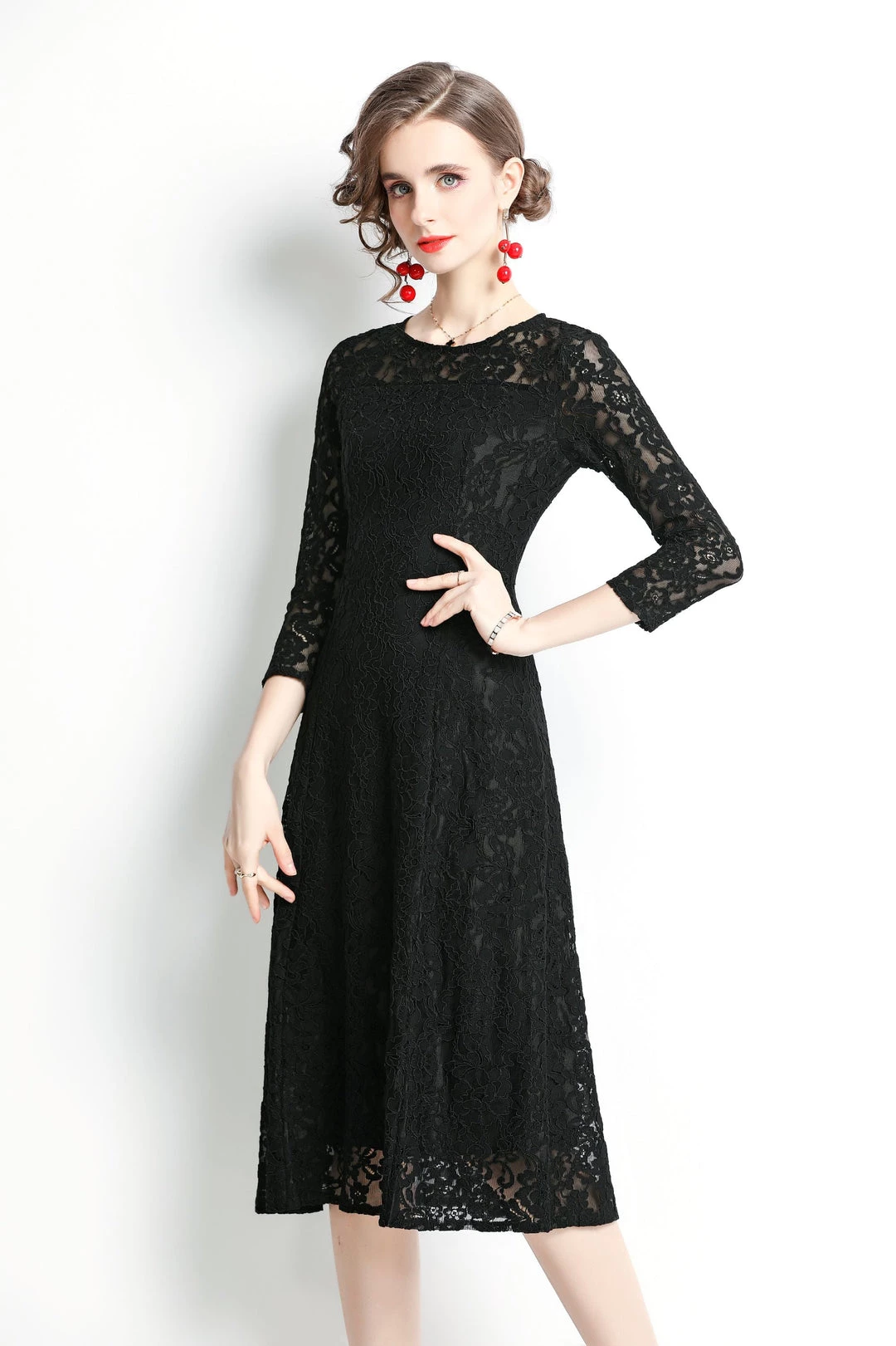 Brand new 🎉 Kaimilan 👩 women Black Evening Classic A-line Crewneck Bracelet Below Knee Lace 👗 Dress 🤩