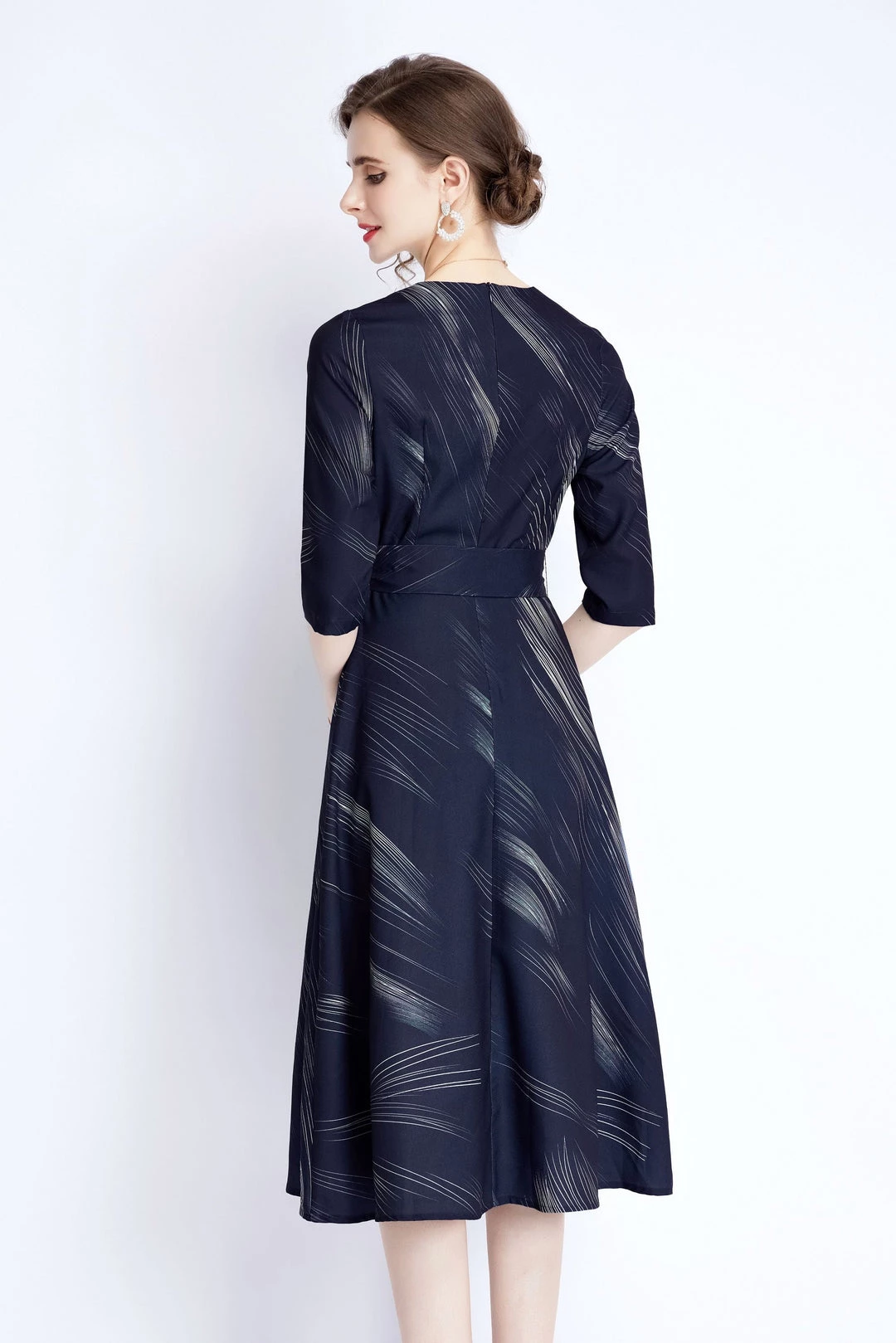 - Design details – a-line silhouette, below knee length, crewneck, elbow sleeve.