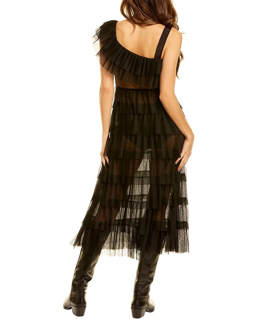 - Tulle Midi Dress In Black With Sheer Dotted Lace Bodice, Asymmetrical Neckline And Tiered Tulle Detailing